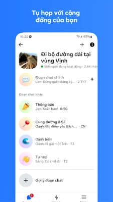 Messenger còn là trung tâm của sự sáng tạo và tương tác cộng đồng. Khám phá Meta AI, trợ lý ảo thông minh giúp bạn giải đáp mọi thắc mắc, đưa ra lời khuyên, hay thậm chí là hỗ trợ tạo nội dung và chỉnh sửa ảnh đầy ấn tượng. Chia sẻ những lát cắt cuộc sống hàng ngày qua Tin và Ghi chú, những khoảnh khắc ngắn gọn sẽ biến mất sau 24 giờ. Tham gia các kênh thông báo của những người sáng tạo yêu thích để không bỏ lỡ bất kỳ cập nhật nào. Cuối cùng, thỏa sức thể hiện cá tính với kho nhãn dán động, GIF, cảm xúc phong phú và cá nhân hóa không gian trò chuyện của bạn bằng vô số chủ đề độc đáo, liên tục được cập nhật.